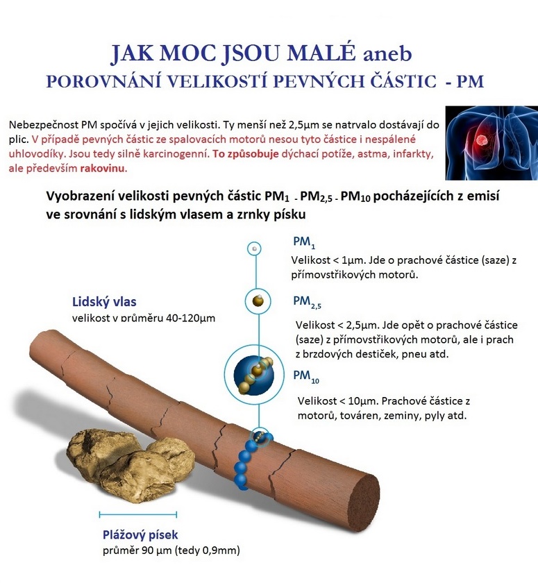 - Právě ale emise z automobilové dopravy s moderními přímo-vstřikovými motory jsou zdravotně to nejhorší. Proč? Pouze moderní motory ve vozidlech produkují ty nejmenší pevné částice, jejichž koncentrace ČSHÚ (český hydro-meteorologický ústav) oficiálně ani neměří! Jde o částice velikostí pod 2,5um – označované jako PM2,5. Pro představu jejich velikosti viz foto ve srovnání s lidským vlasem.