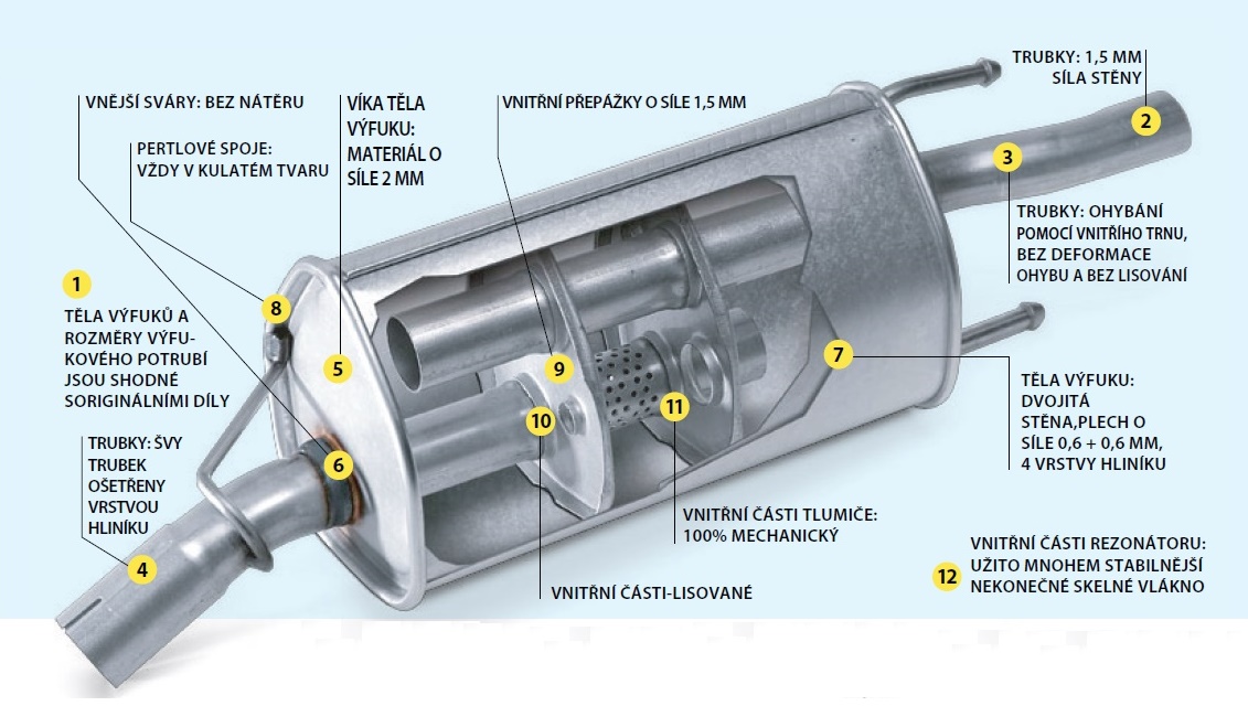 Na tomto obrázku lze vidět 11 klíčových bodů, které lze sledovat z hlediska materiálové a konstrukční kvality výfukových tlumičů. Konkrétní zde uvedené hodnoty tloušťky materiálu odpovídají italskému výrobci MTS, který lze považovat za současný etalon kvality jak v konstrukci, tak v kvalitě materiálu a v tloušťce pohliníkovaného plechu jednotlivých částí.